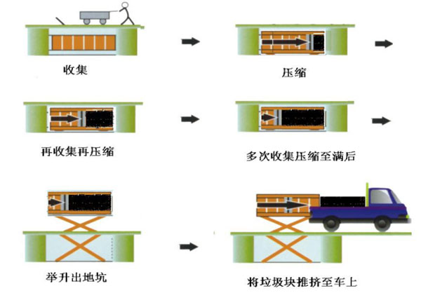 水平式生活垃圾壓縮中轉設備是將垃圾的卸(出)料、壓縮、儲存集合在一起,整體落于地下,利用地下空間將垃圾密閉在箱體內,地面上無垃圾外露現象,壓縮垃圾產生的污水經排污管道直接流入污水井內,然后由污水泵排到城市污水管網,徹底解決了垃圾在收集、儲存、裝運過程中的污染環境、作業效率低等問題。整個設計僅有上蓋板露出地面。