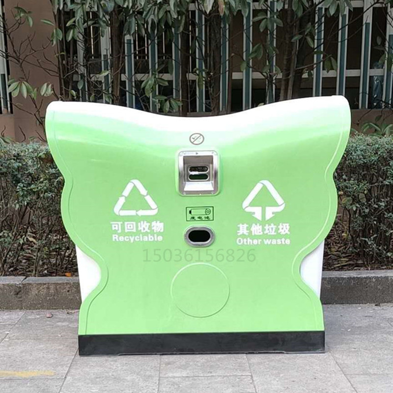 新款模壓耐高溫蝴蝶式垃圾桶果皮箱,由頂蓋、側板、底座、支架、內膽、煙蒂收集盒、廢電池回收盒等附配件組成。