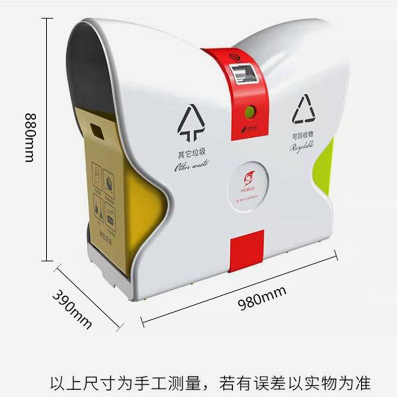 4.側板文字標識采用絲網印刷,印刷有“可回收物” “其他垃圾”,分類標識參照《城市生活垃圾分類標識》規定的名稱、圖形、符號和顏色要求,LOGO可定制。